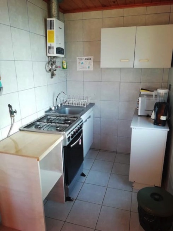 Cocina equipada completa con refrigerador, cocina con horno, microondas, hervidor, licuadora, vajilla, etc.