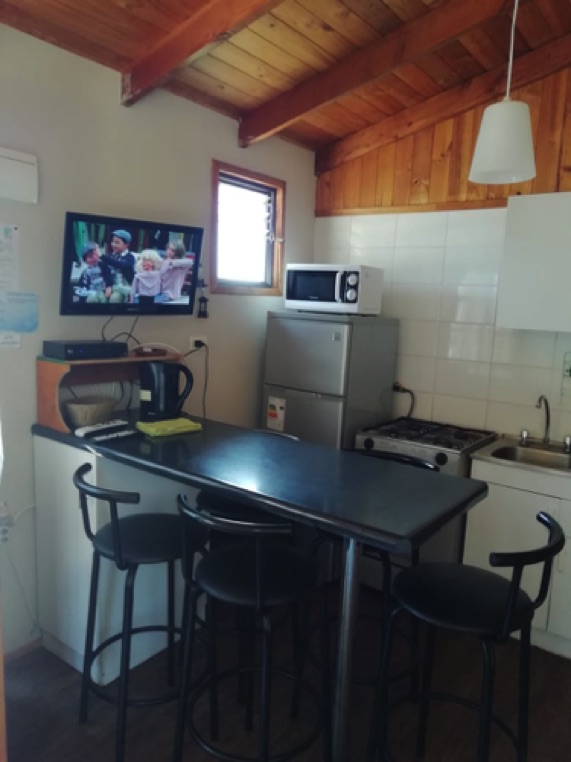 Cocina equipada completa con refrigerador, cocina con horno, microondas, hervidor, licuadora, vajilla, etc.