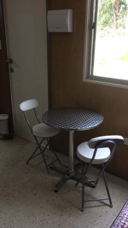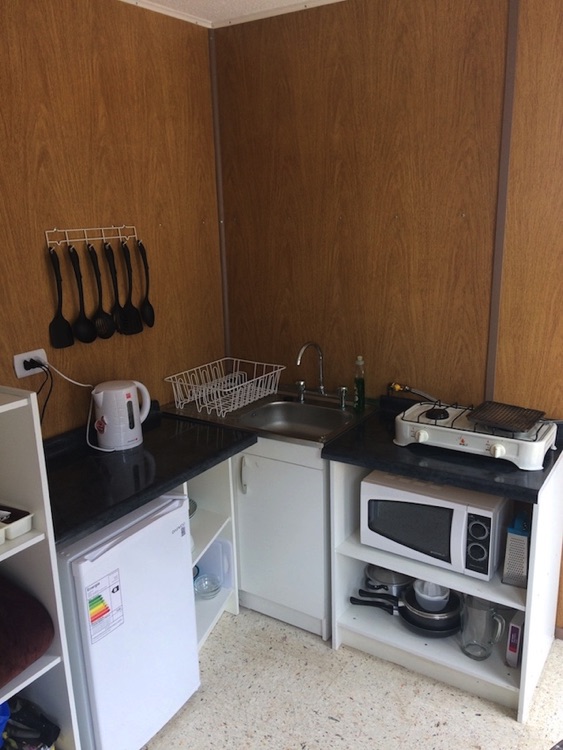 Kitchenette quipada con: encimera con dos quemadores, microondas, hervidor, licuadora, vajilla, etc.